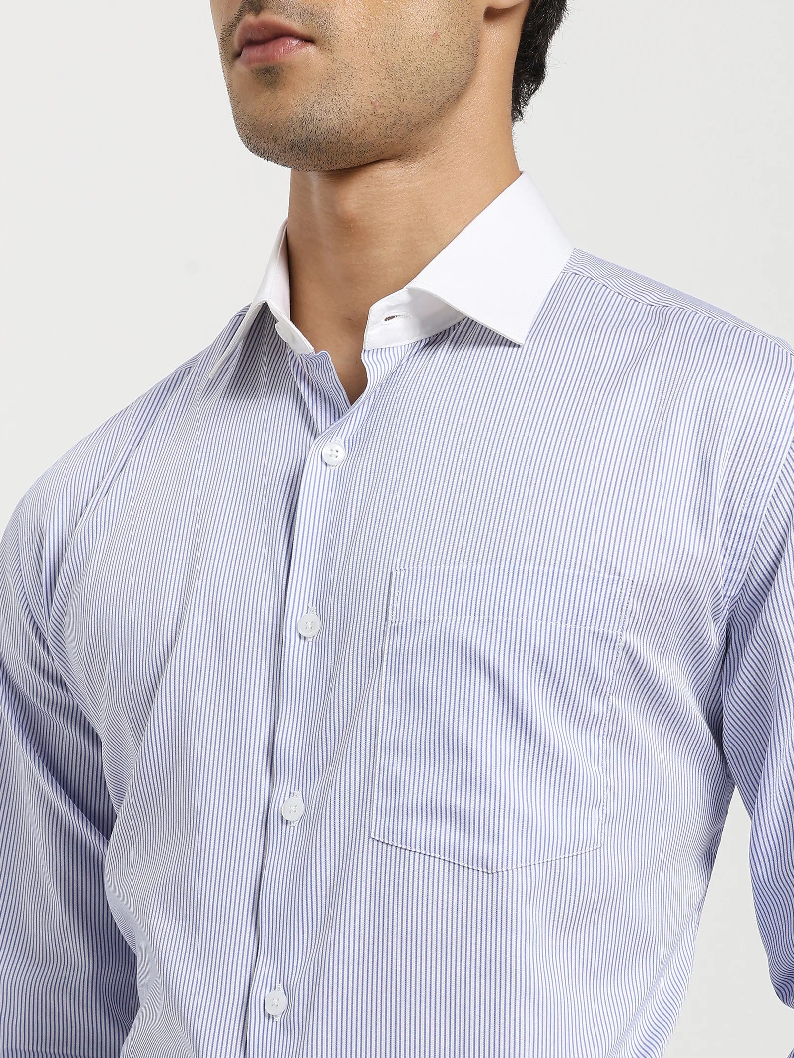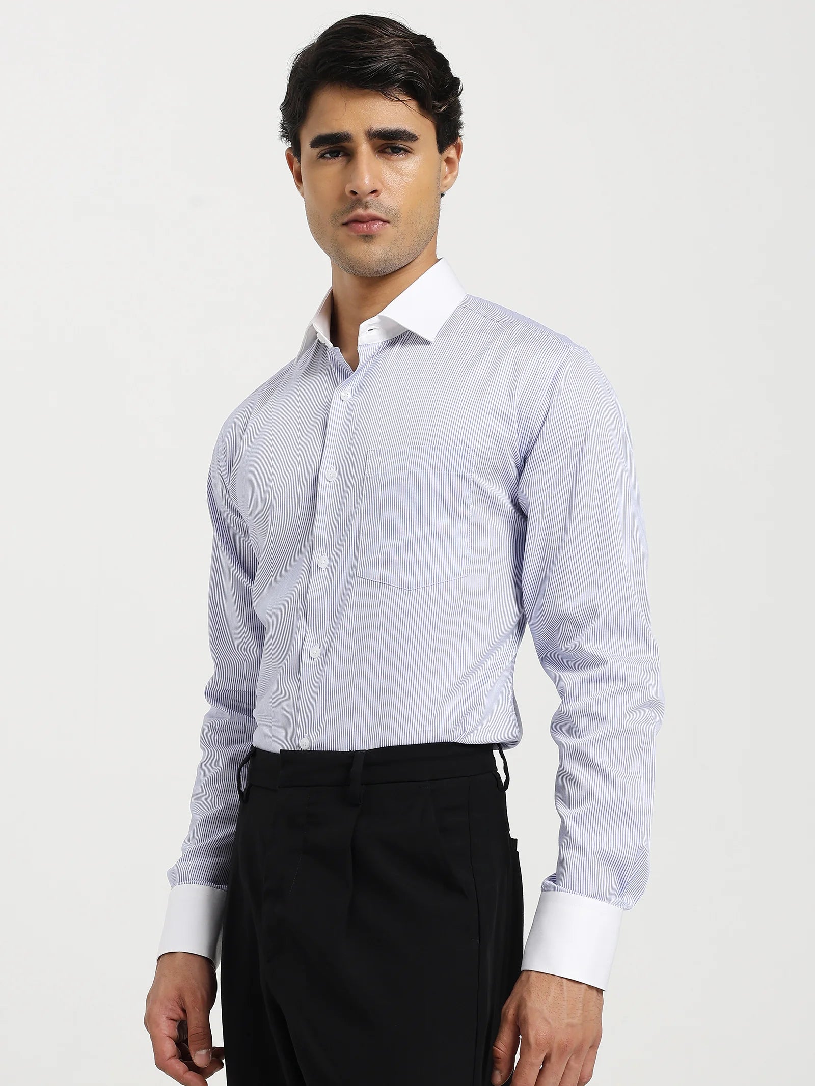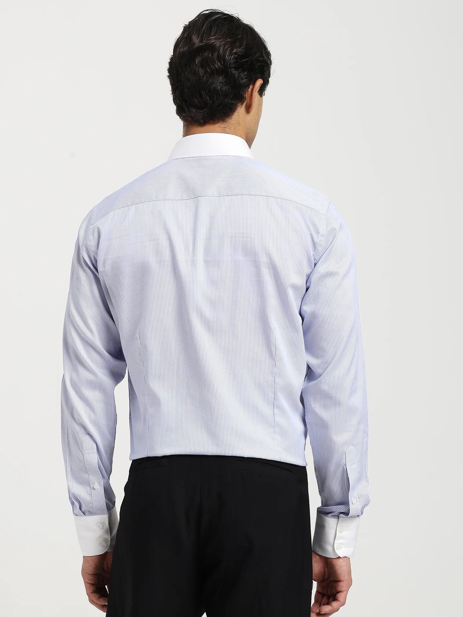 Step into confidence with the Boardroom Blue Stripe Shirt - a sharp essential crafted for men who mean business. The fine blue pinstripes deliver timeless sophistication, while the double button cuff detail adds a touch of authority and refinement. Tailored in breathable premium cotton, this shirt is made to order & totally customisable, ensuring a fit and finish that feels personal. Whether it’s a high-stakes meeting, a presentation, or a formal occasion, this piece anchors your wardrobe with quiet power.