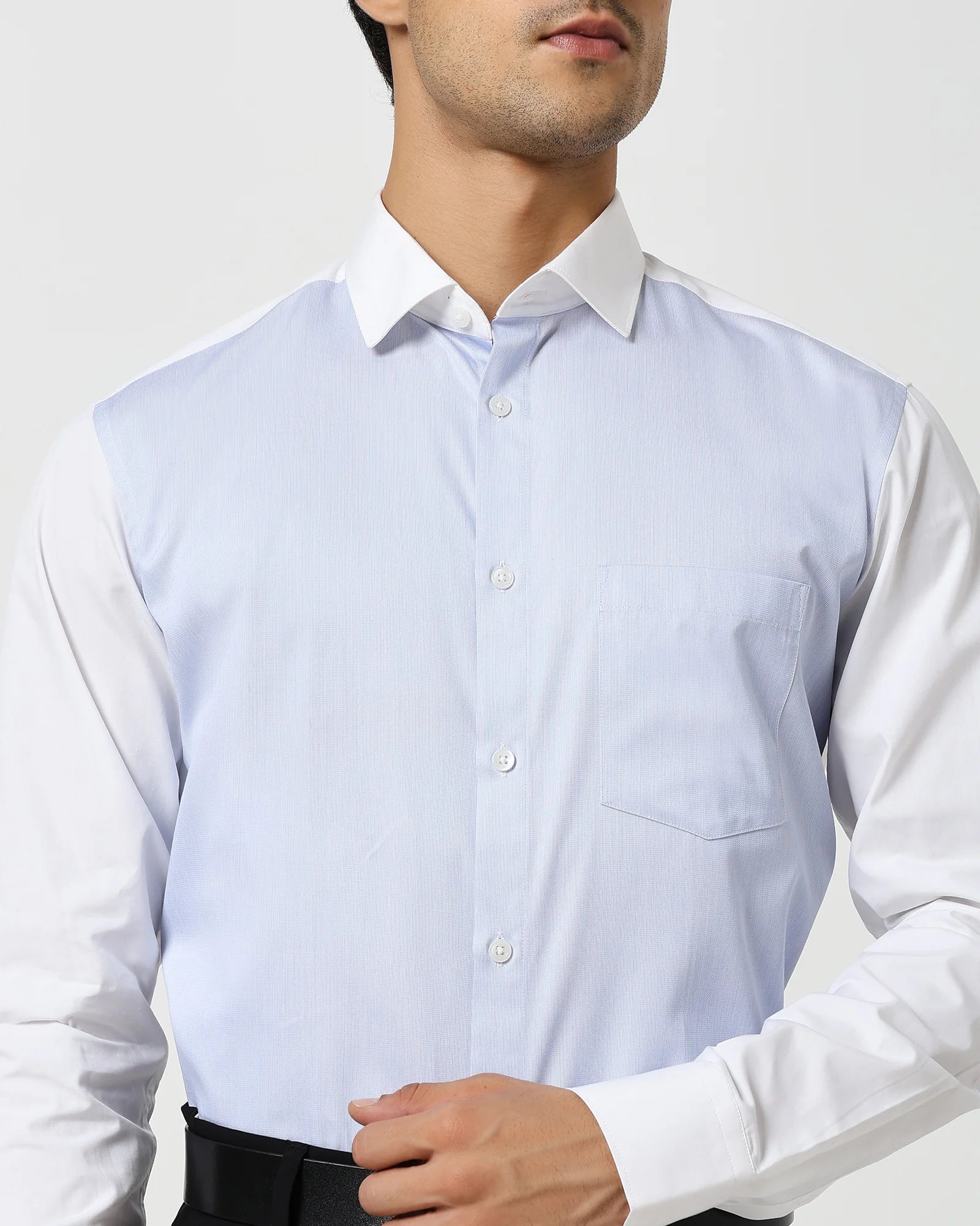 Masterfully crafted to add a sophisticated touch to your professional wardrobe, this Crystalline Blue & White Shirt captures the essence of refined style. The shirt features a striking front with blue stripes that command attention while the rest of the shirt is seamlessly tailored in pristine white, creating a contrast that is both bold and balanced. Made from fine cotton, it promises all-day comfort and breathability. Perfect for the boardroom or formal occasions, this shirt seamlessly blends classic elements with contemporary design.