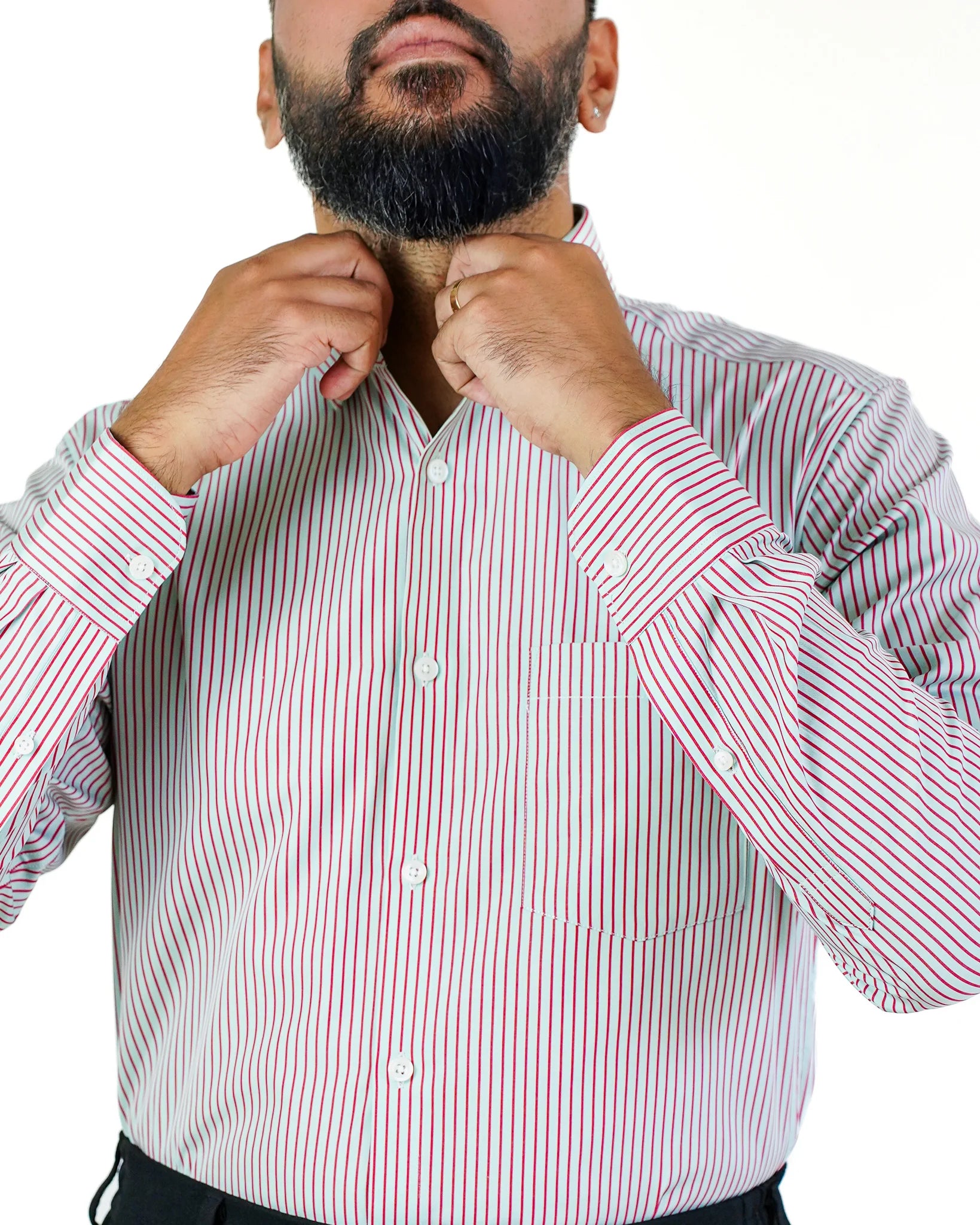 The shirt's fabric quality is top-notch, with impeccable stitching throughout. The customised collar that was demanded by me was added which was done and the shirt came especially the collars and cuffs came out to be perfect personalized touch clean, sharp, and well-crafted.
