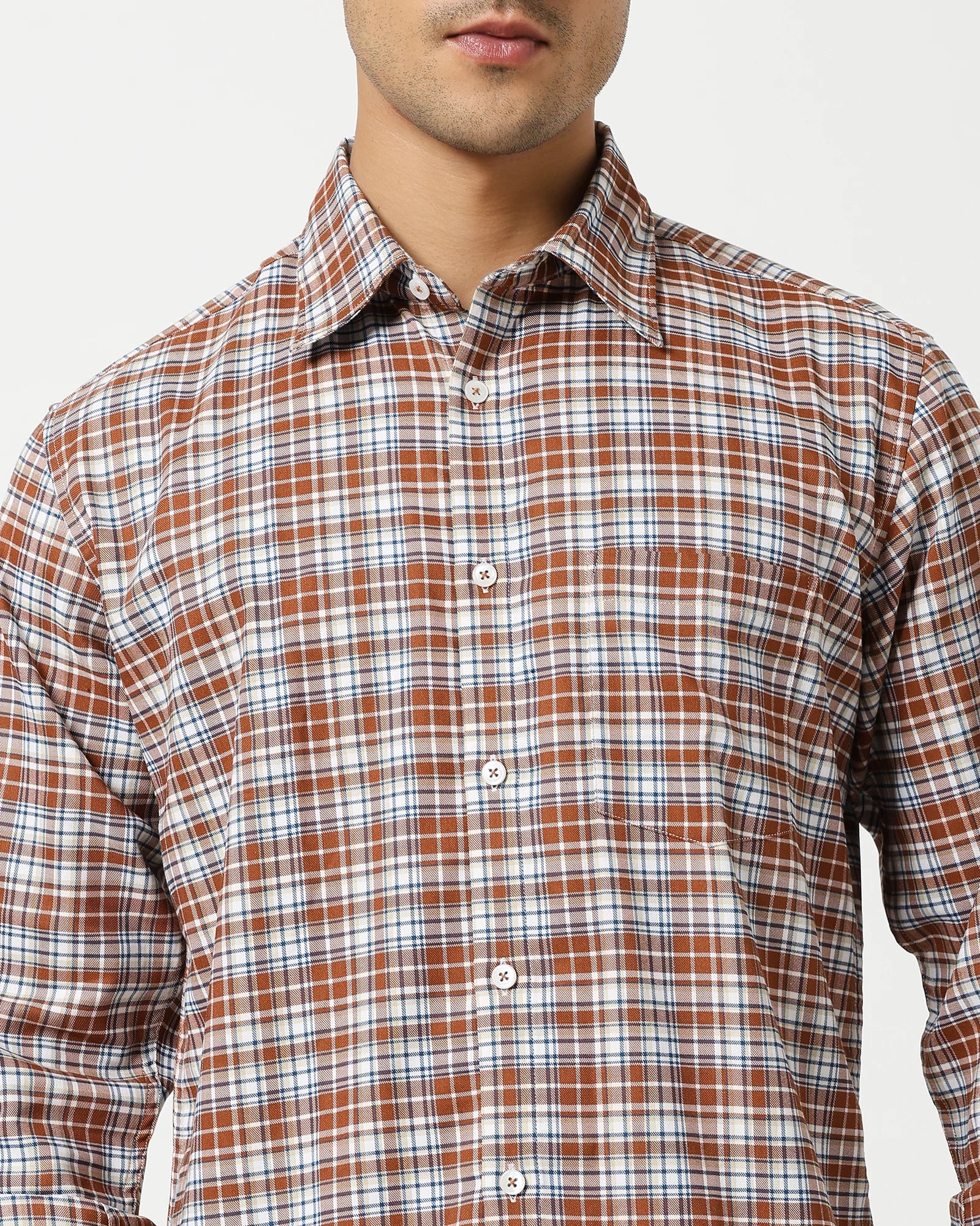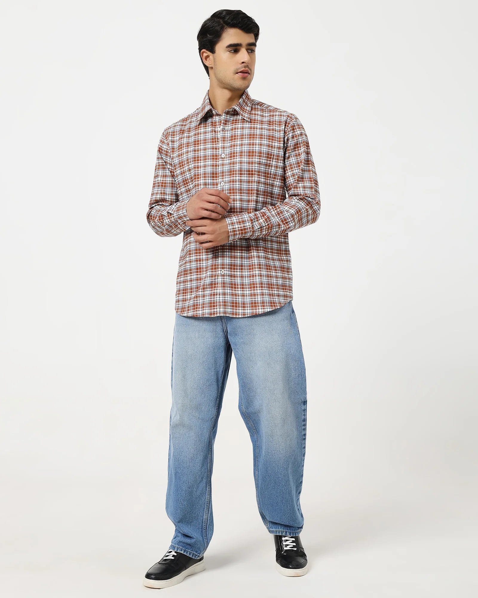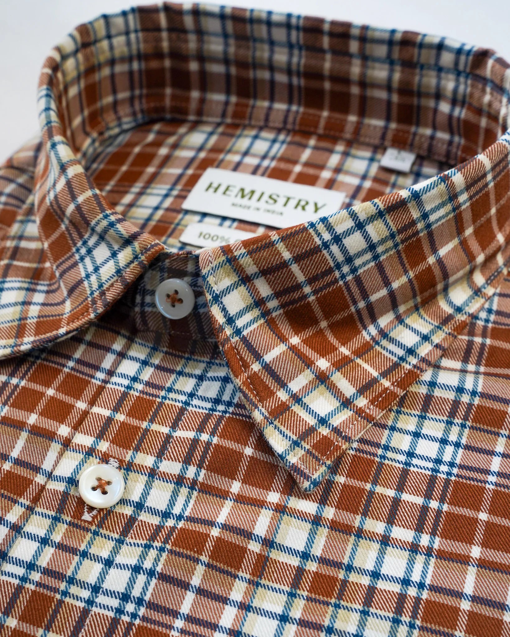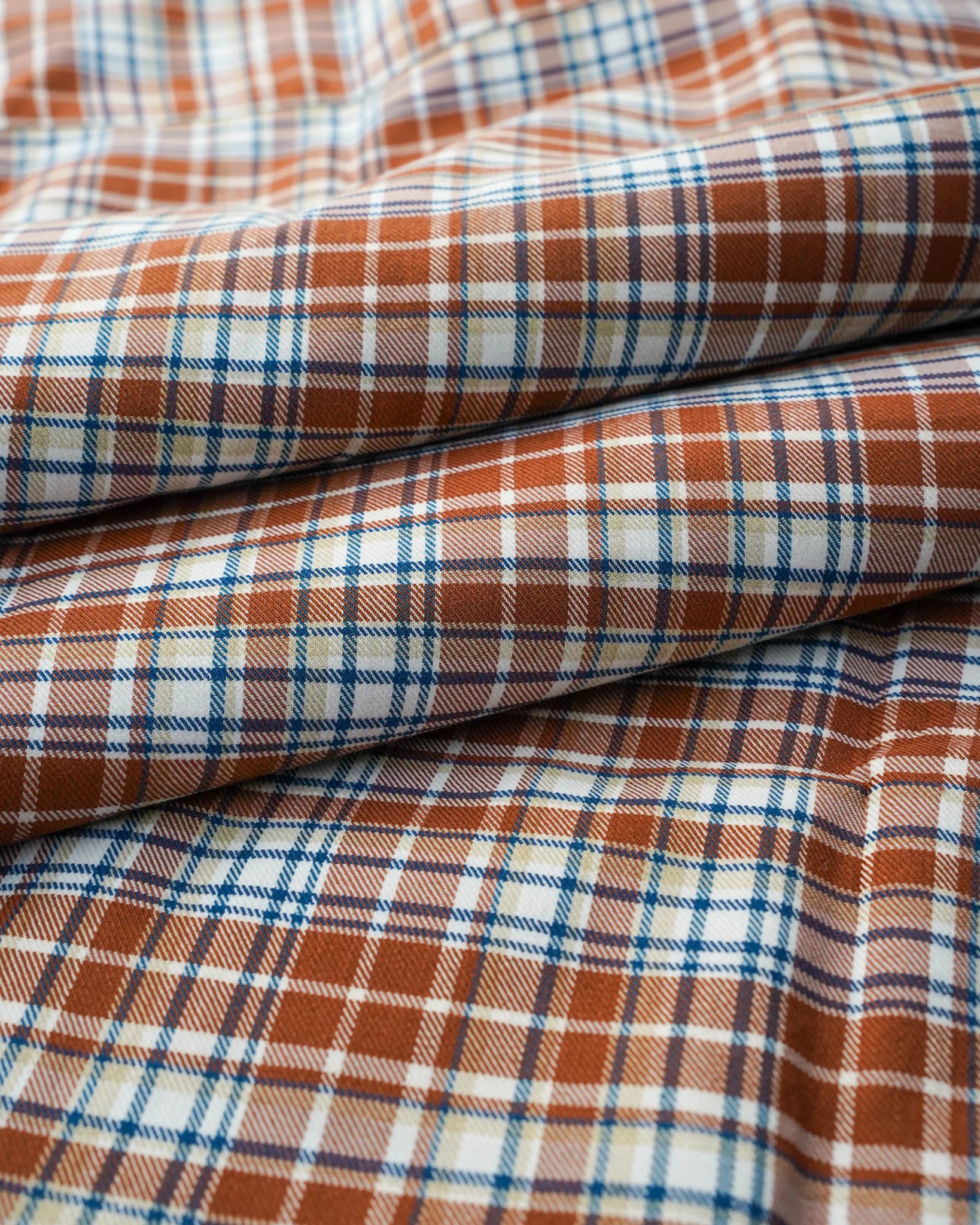 A shirt that feels like heritage stitched into fabric. The Heritage Countryside Twill Plaid Shirt carries the warmth of earthy rust tones balanced with cool blues and clean whites, creating a checkered pattern that feels both timeless and versatile.
