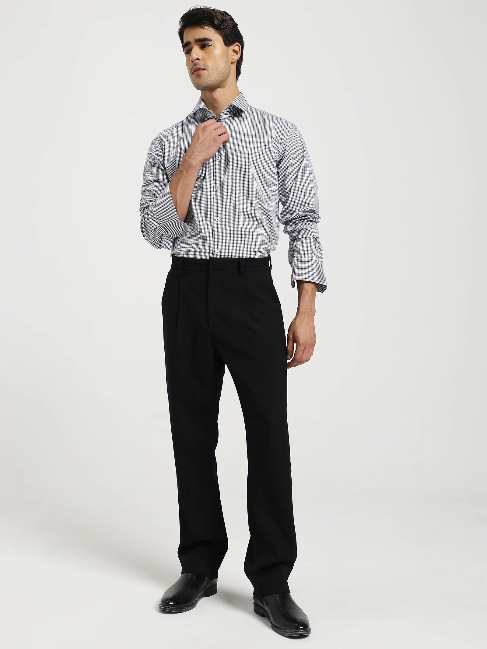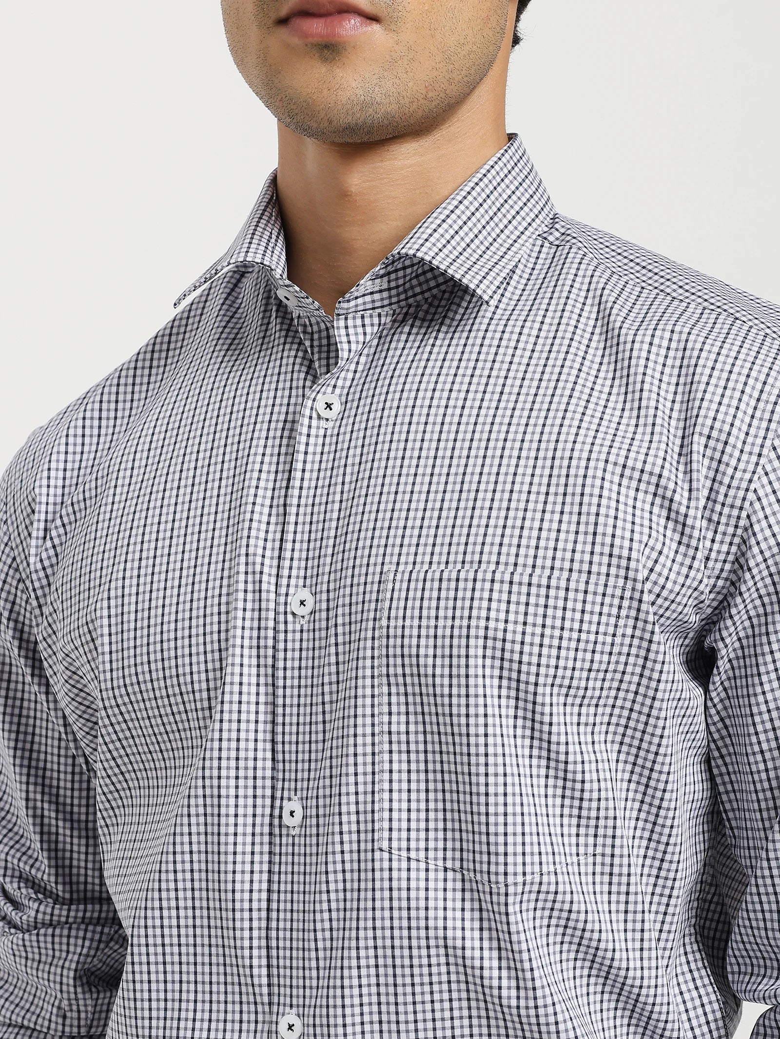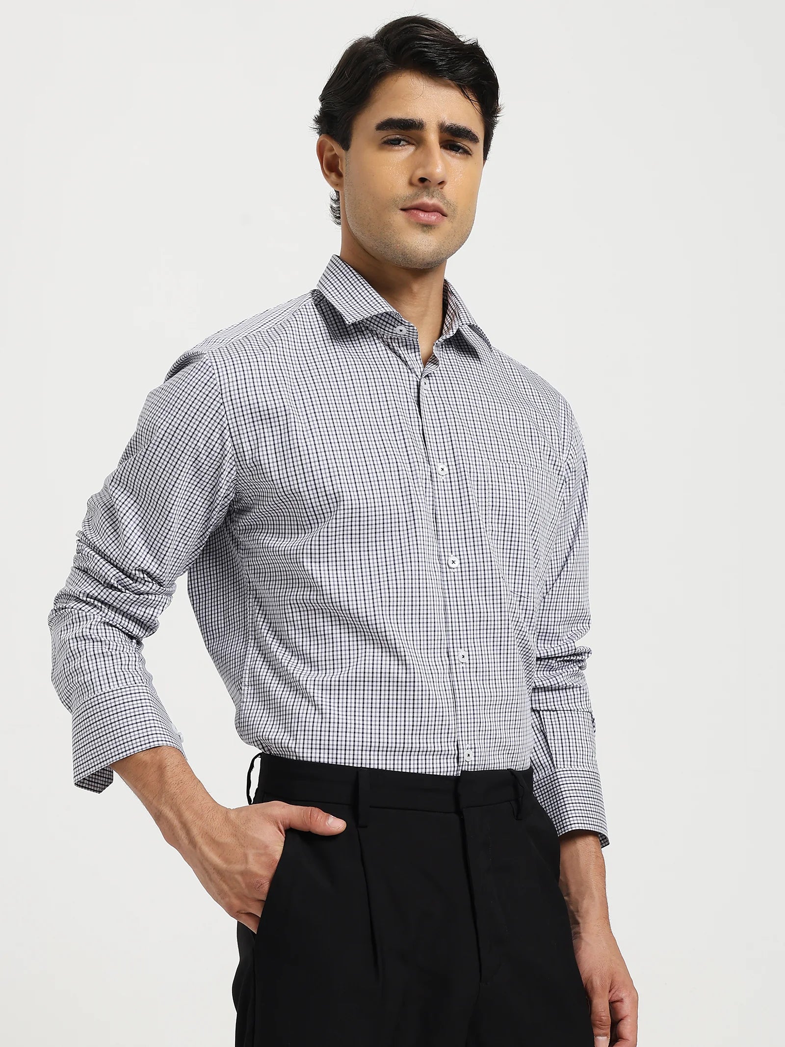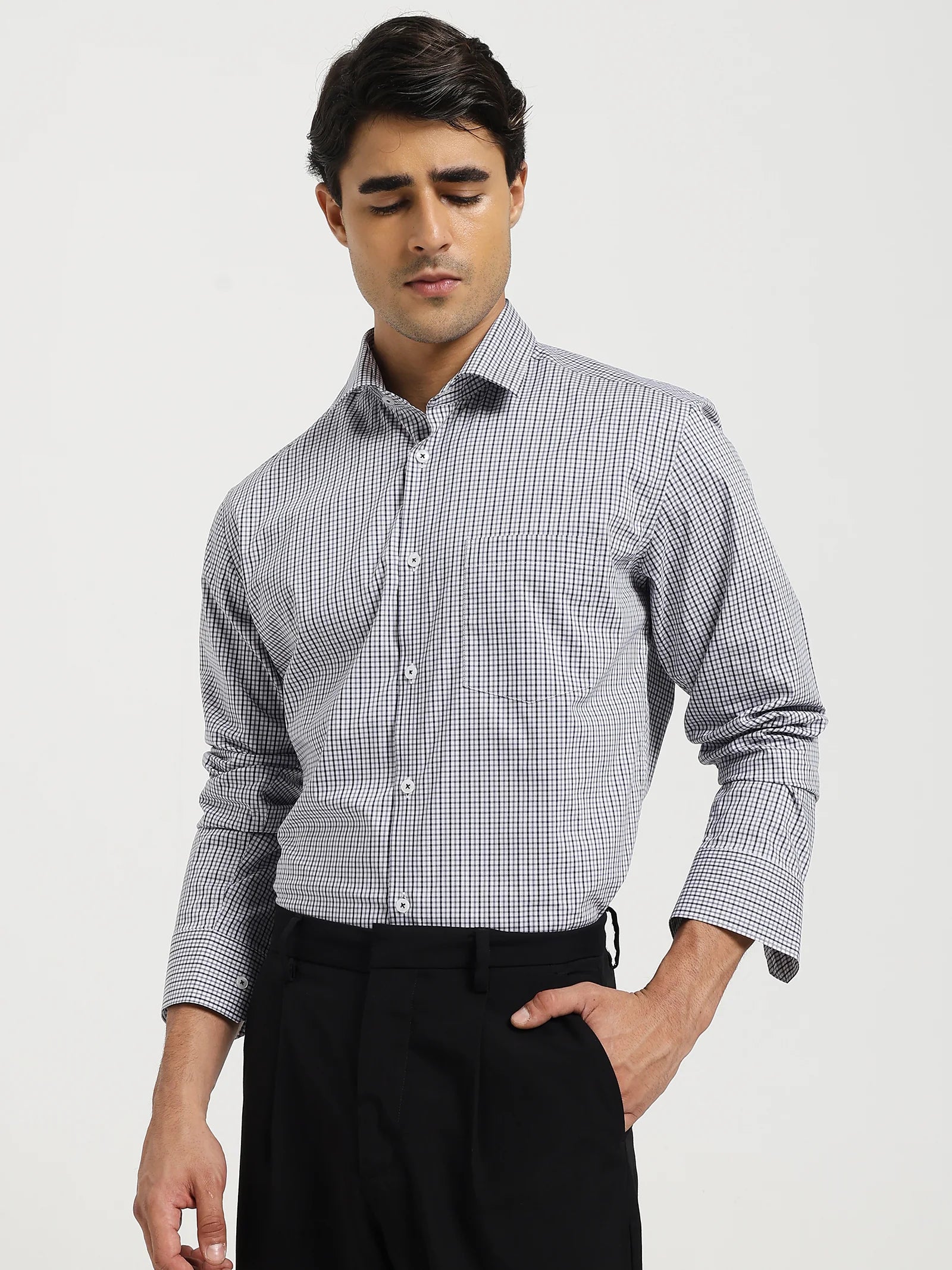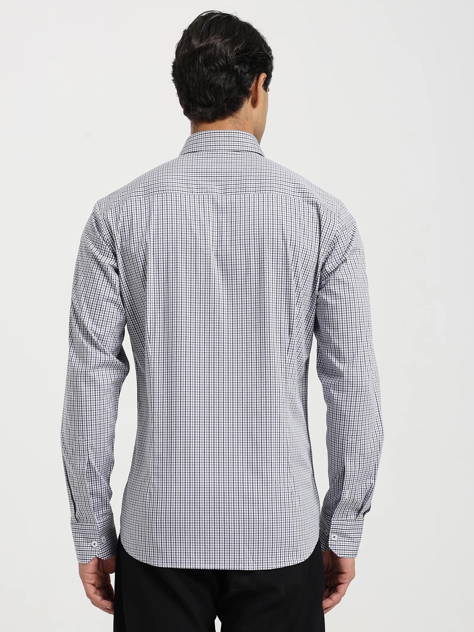 Some shirts you wear. Others, you carry like second skin. The Midnight Grid Check Shirt is one of them. Designed for the man who thrives between boardroom discussions and casual evening plans, it blends the comfort of cotton with the durability of recycled polyester. The subtle navy-and-white check pattern speaks of quiet confidence, while the regular-soft fused collar keeps it easy and semi-casual. Whether it’s that Monday meeting or Friday’s dinner, this shirt is stitched to keep pace with your week—without losing its edge.