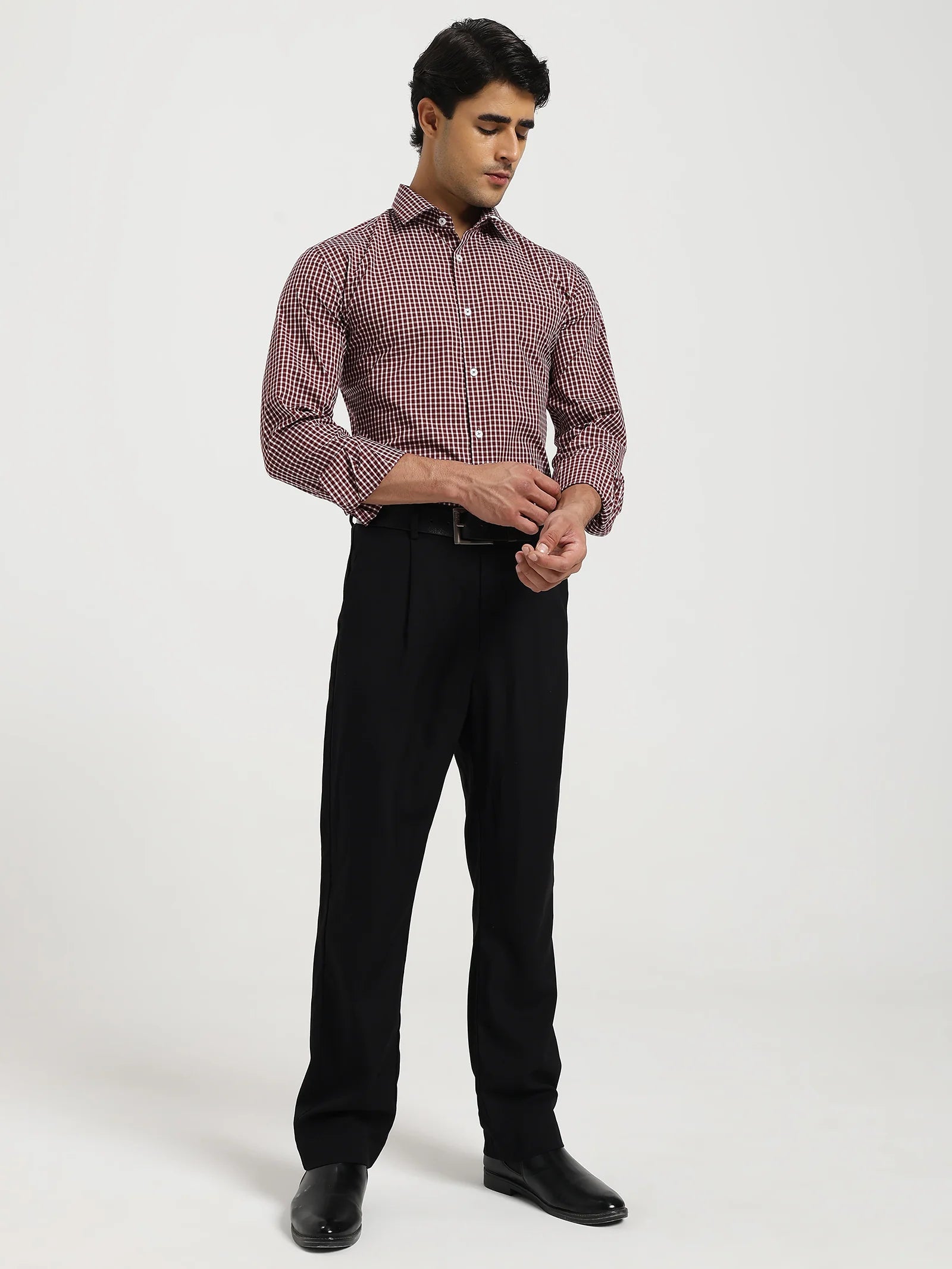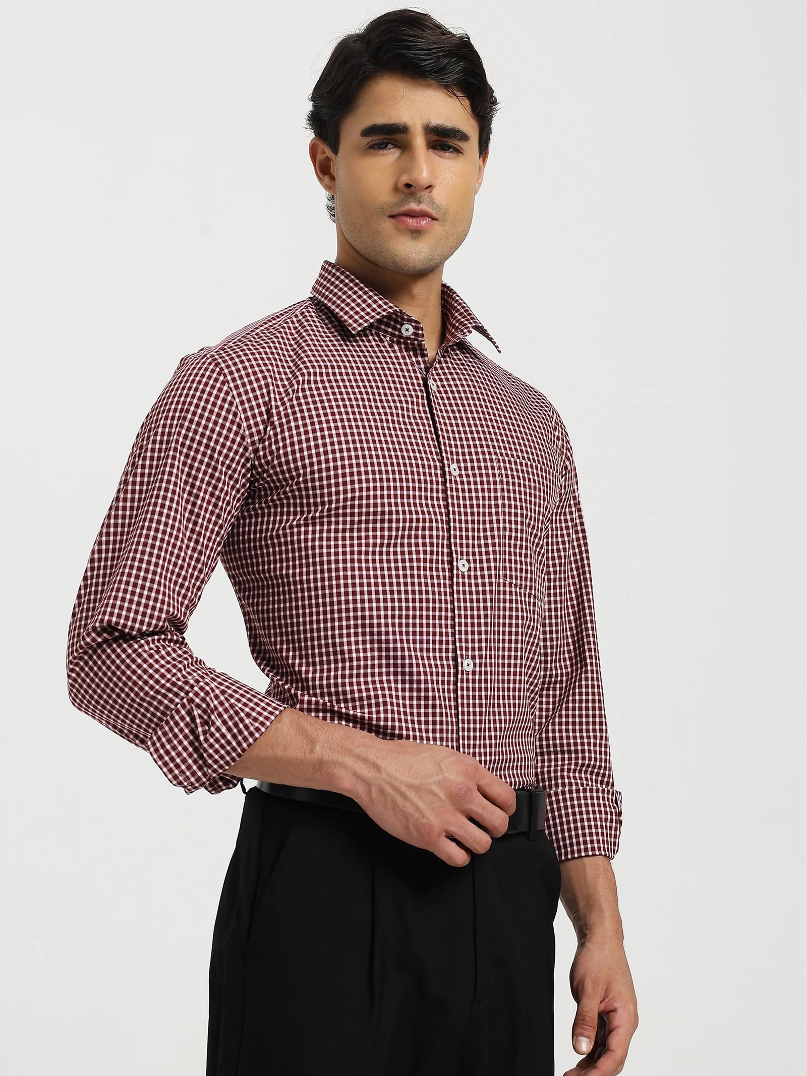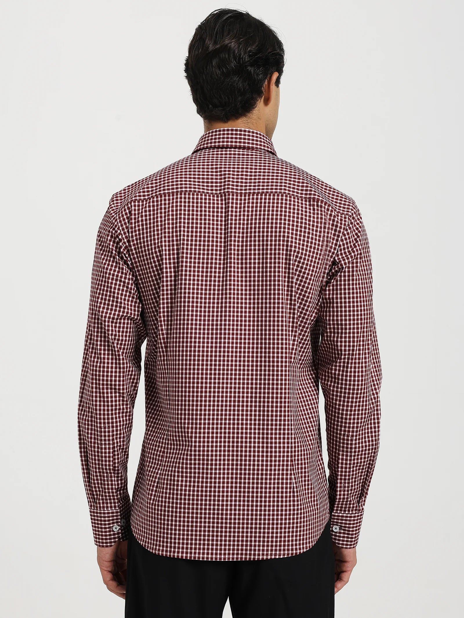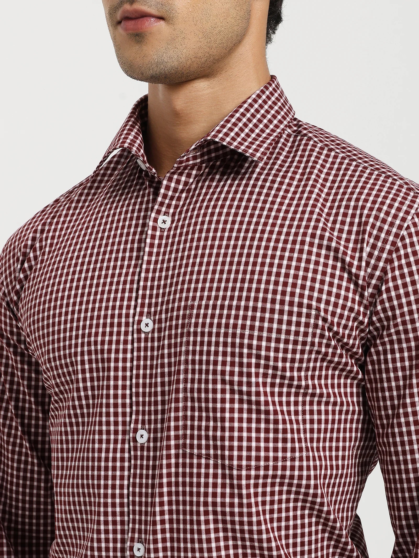 The Maroon Micro Check Stretch Shirt blends rich maroon checks with crisp white for a sharp yet easy-going look. Crafted in a breathable cotton-spandex blend, it moves with you, keeps its shape, and feels comfortable all day. The regular-soft collar makes it perfect for both office hours and after-hours.