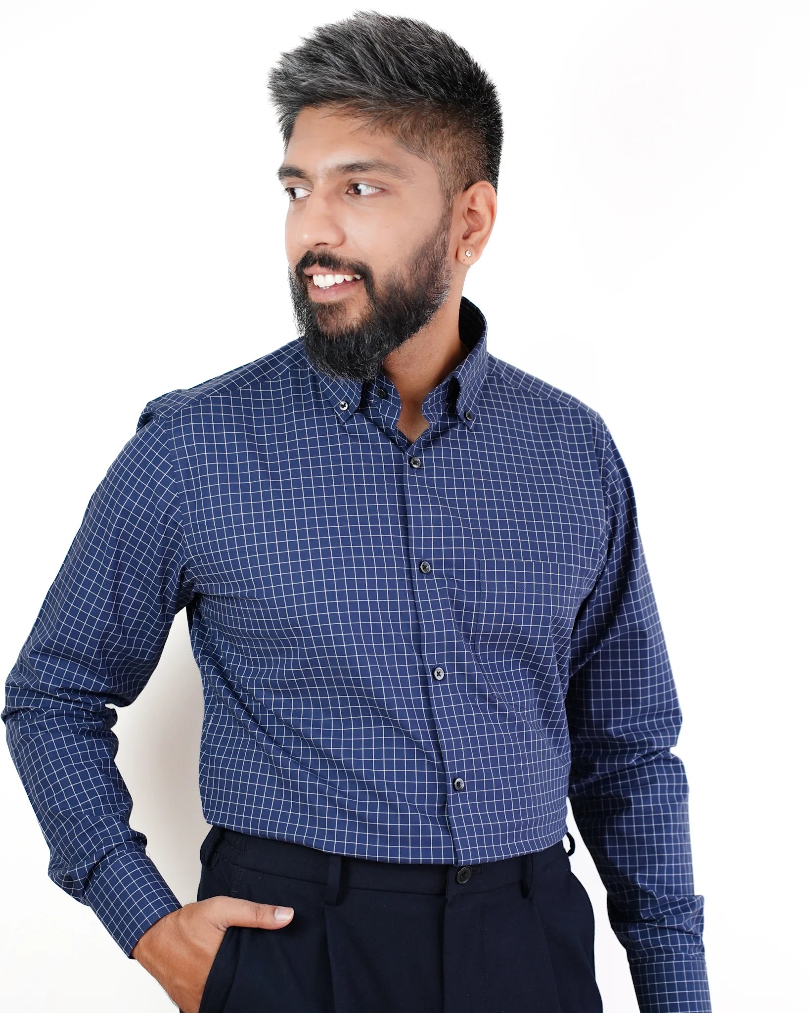 Experience timeless style with our Navy Windowpane Button Down Check Shirt, crafted from 100% premium cotton for exceptional comfort and durability. The deep navy base is elegantly adorned with crisp white checks, offering a perfect blend of classic sophistication and modern flair. This shirt is designed to elevate both your professional and casual wardrobe, maintaining its luxurious feel and vibrant color wash after wash.