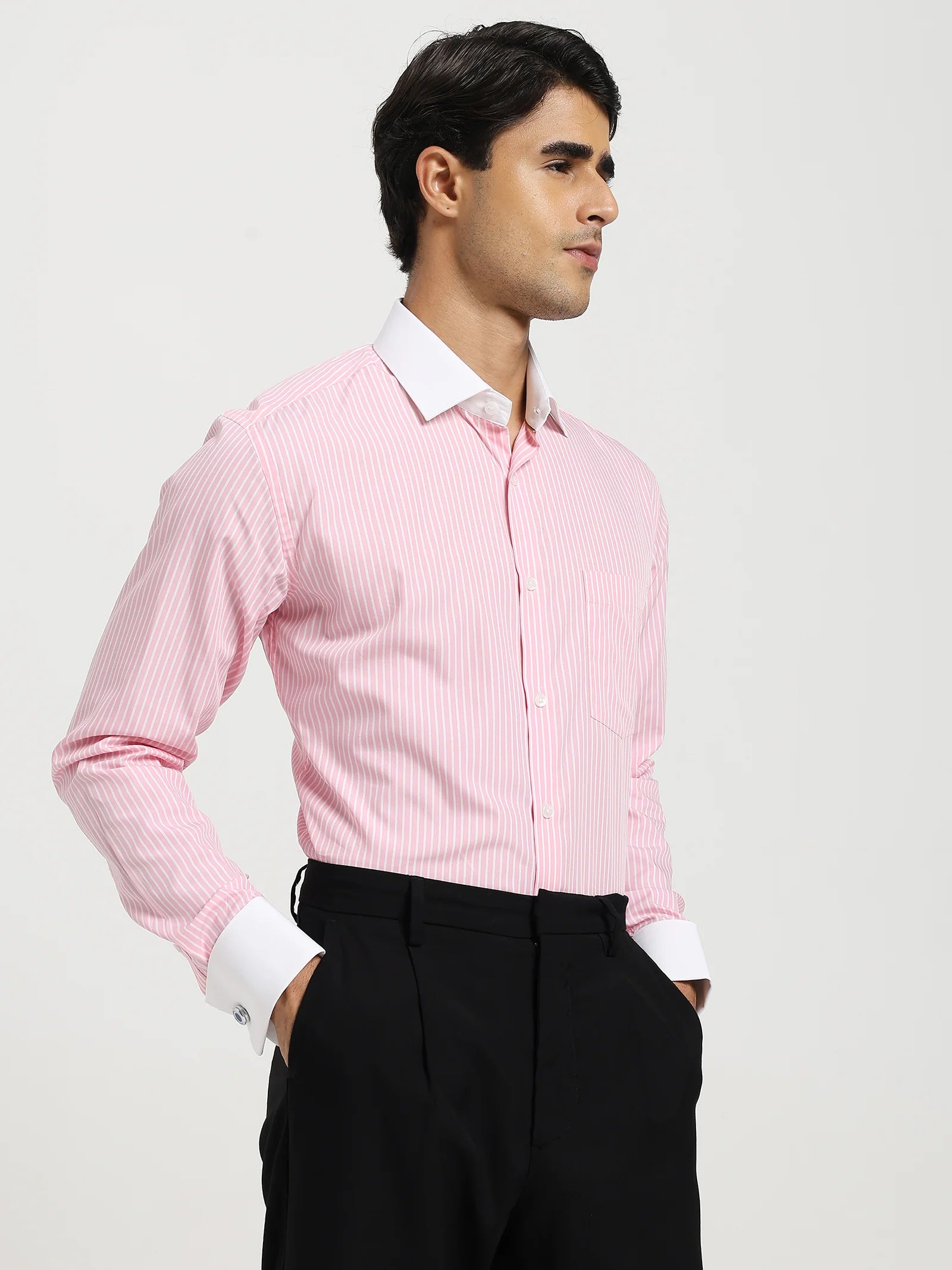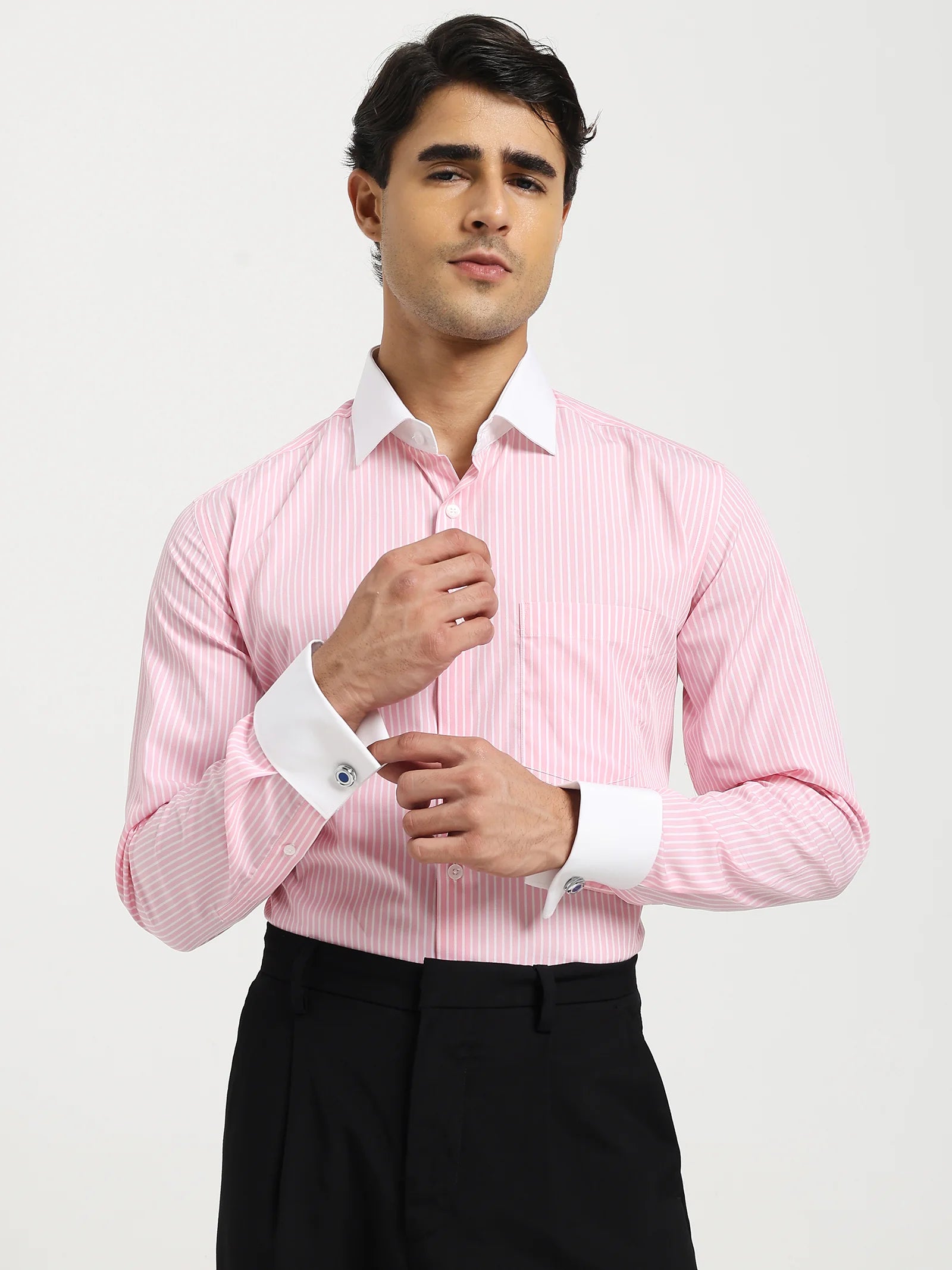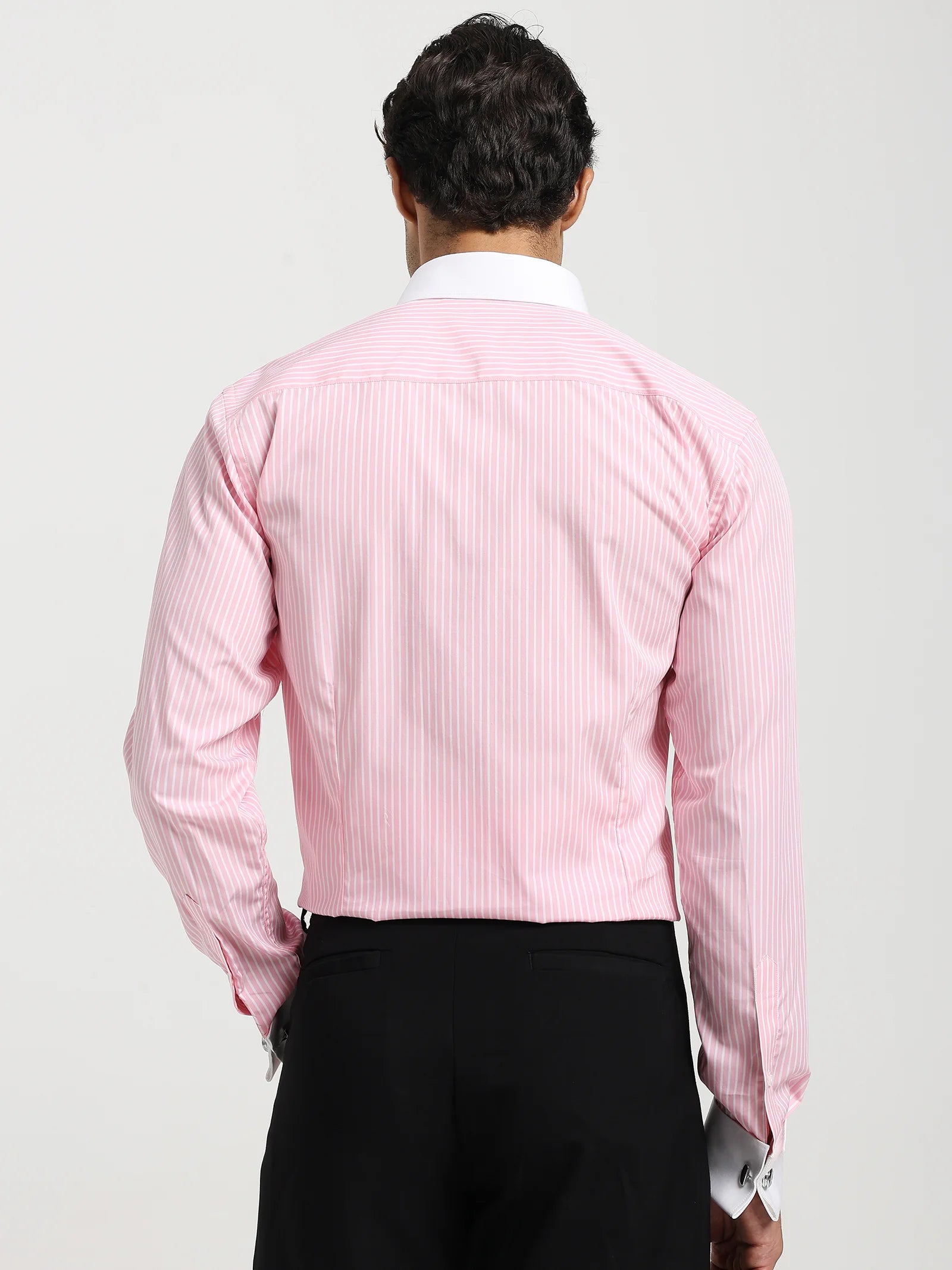 A nod to refined tailoring, the Rosé Royale Contrast Collar Shirt blends timeless charm with modern precision. Crafted from 100% premium cotton, its soft pink vertical stripes exude understated elegance, while the crisp white collar and French cuffs deliver a bold, distinguished contrast. The breathable weave ensures year-round comfort, and its made-to-order construction means every shirt is cut, stitched, and finished for lasting form and flawless drape. Built not just for the season, but for years of confident wear.