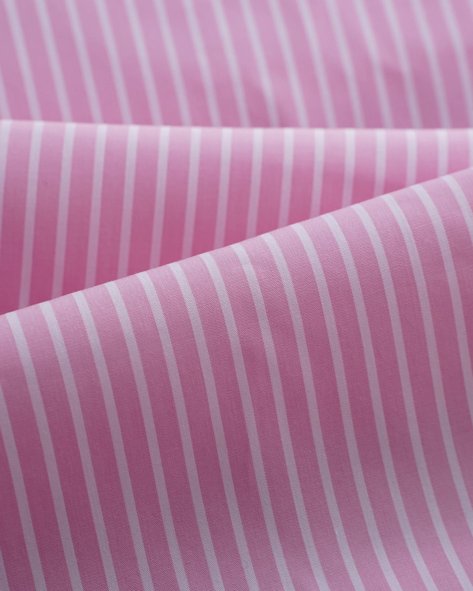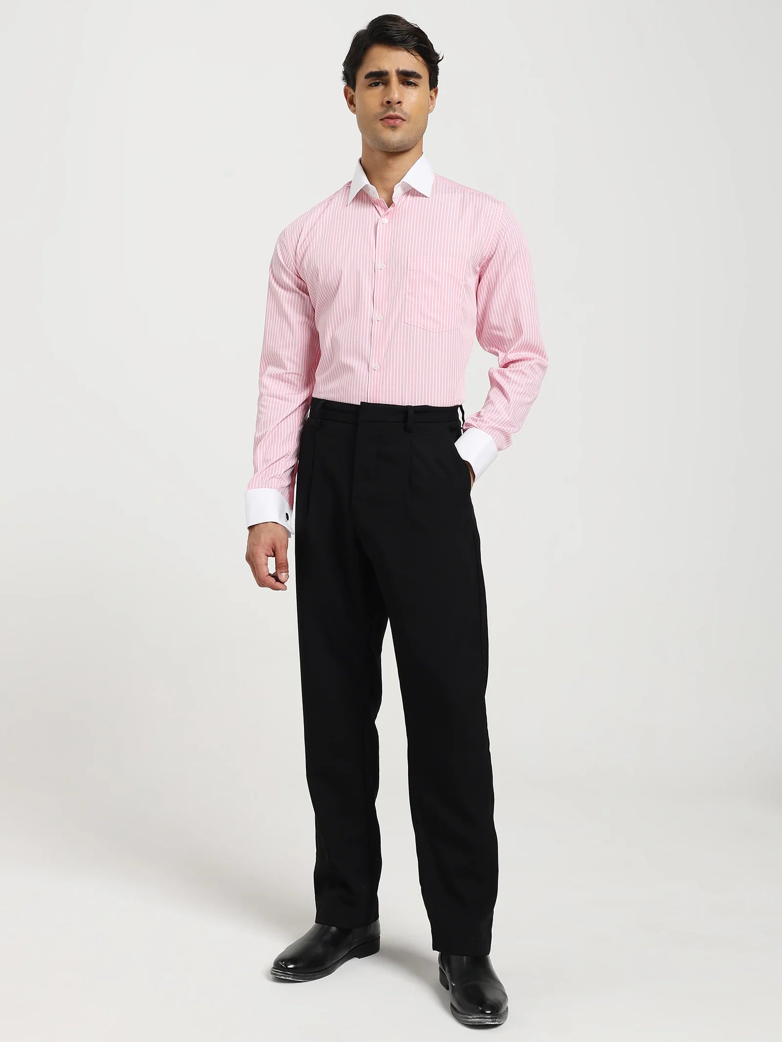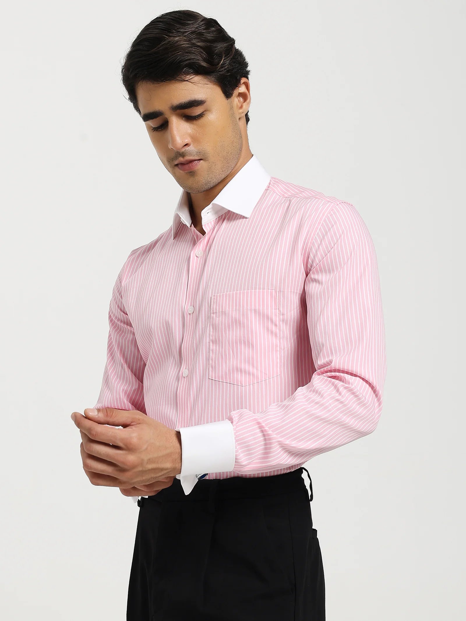 A nod to refined tailoring, the Rosé Royale Contrast Collar Shirt blends timeless charm with modern precision. Crafted from 100% premium cotton, its soft pink vertical stripes exude understated elegance, while the crisp white collar and French cuffs deliver a bold, distinguished contrast. The breathable weave ensures year-round comfort, and its made-to-order construction means every shirt is cut, stitched, and finished for lasting form and flawless drape. Built not just for the season, but for years of confident wear.