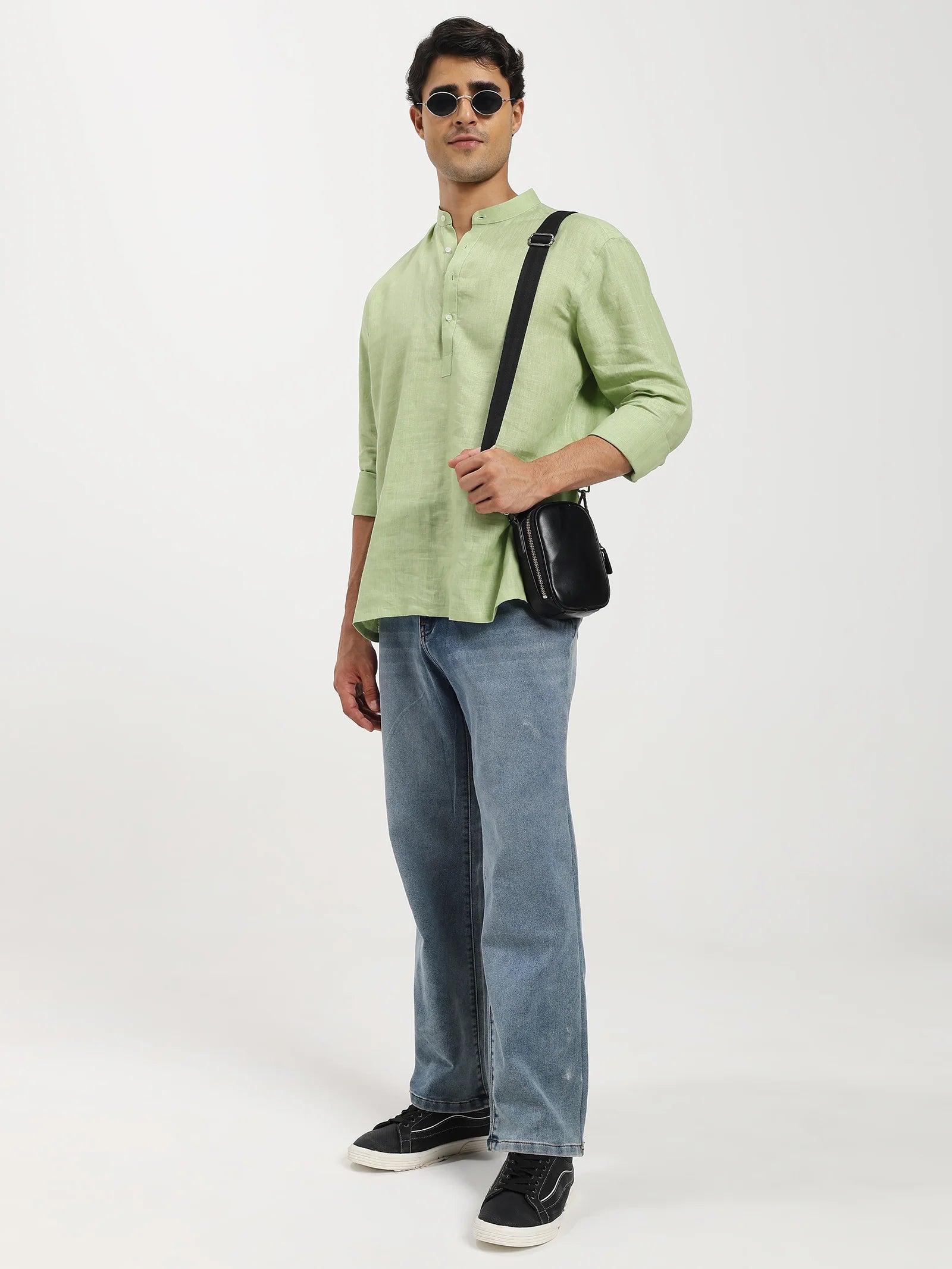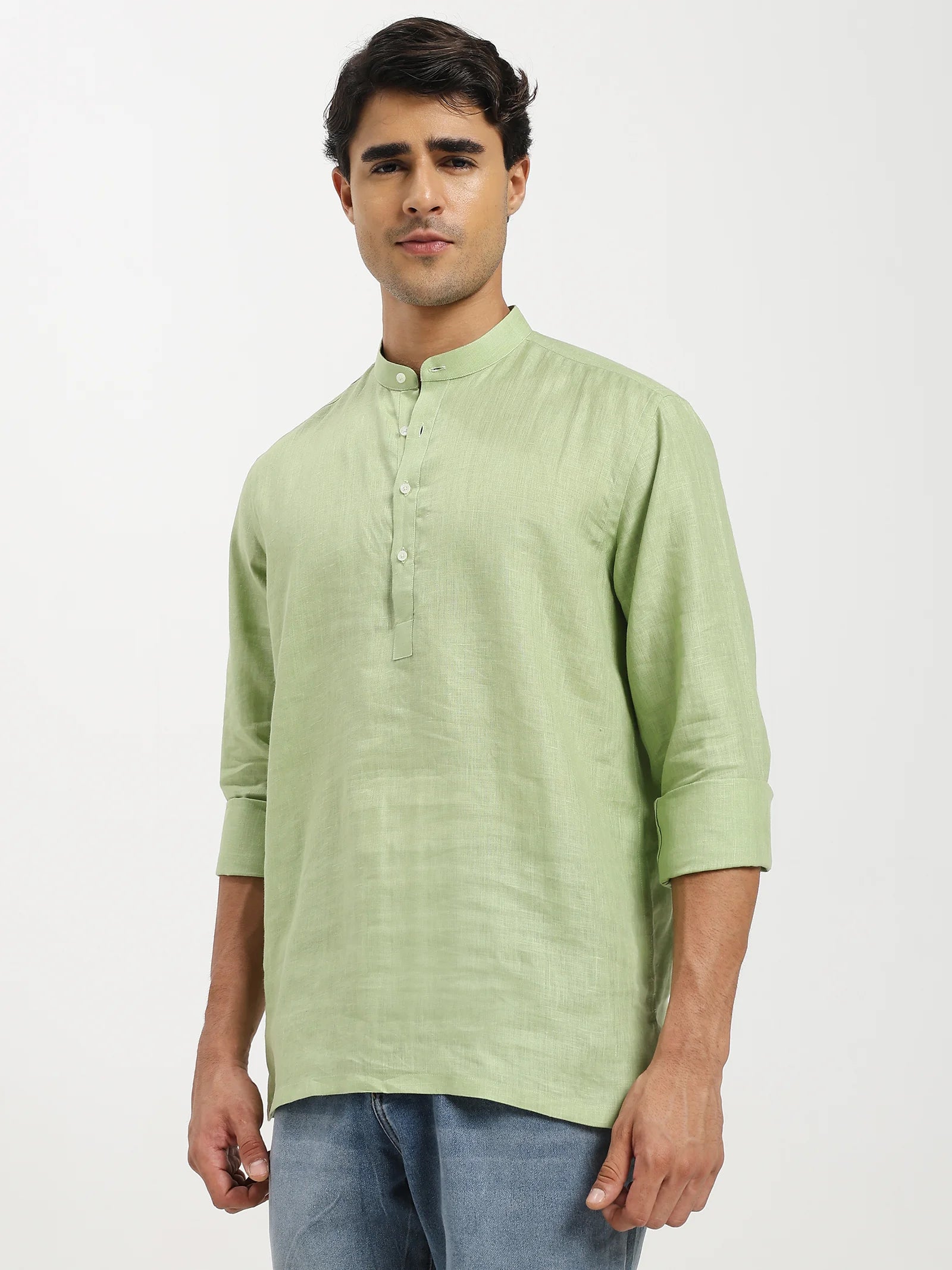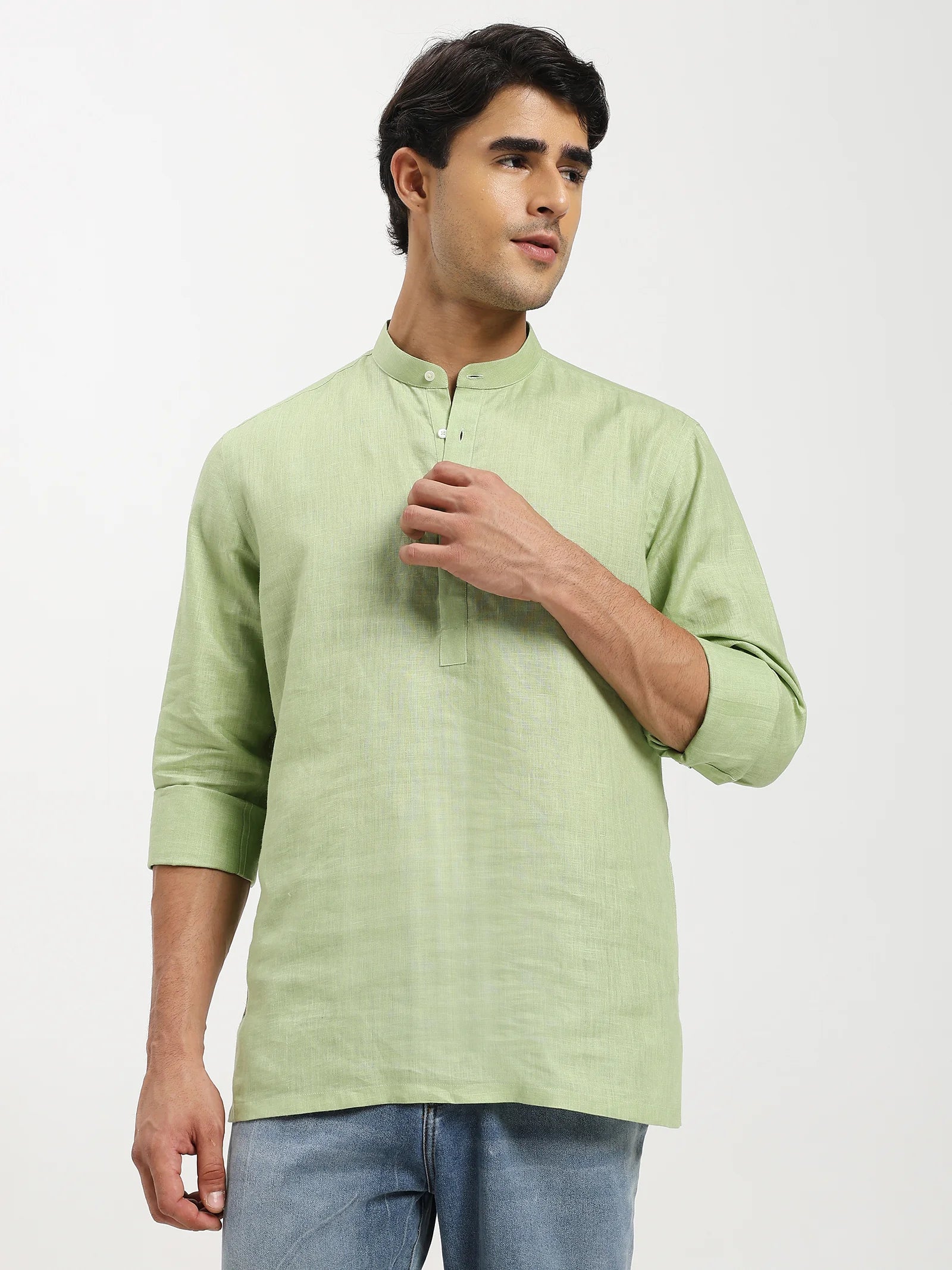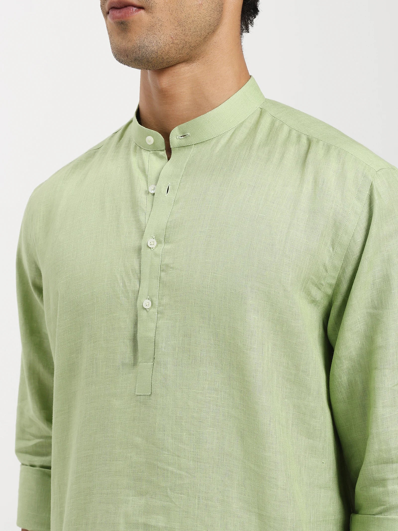 The Verdant Linen Short Kurta is designed for the modern gentleman who values elegance with ease. Crafted from 100% pure linen, it offers a natural breathability that keeps you cool while exuding timeless sophistication. The soft green hue reflects freshness and refinement. The kurta's fluid drape and airy weave make it ideal for both relaxed evenings and polished daytime affairs. A piece built not just to be worn, but to be lived in season after season.